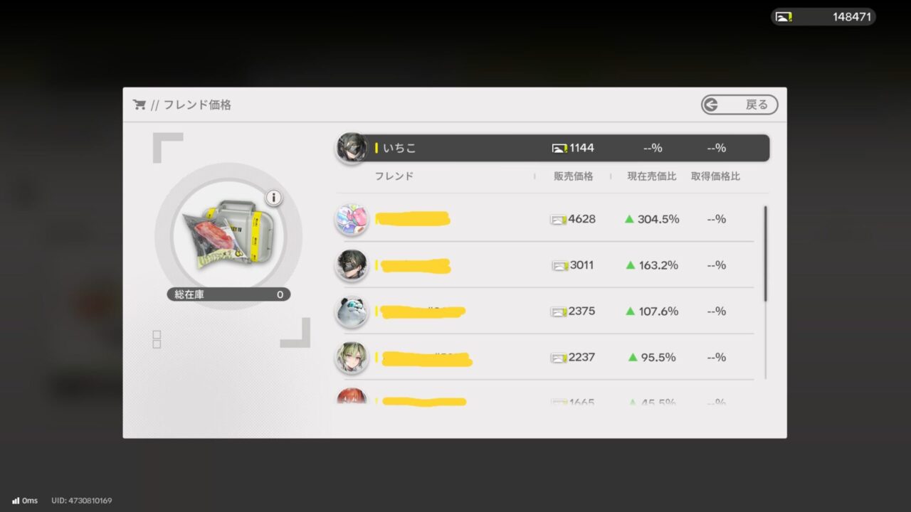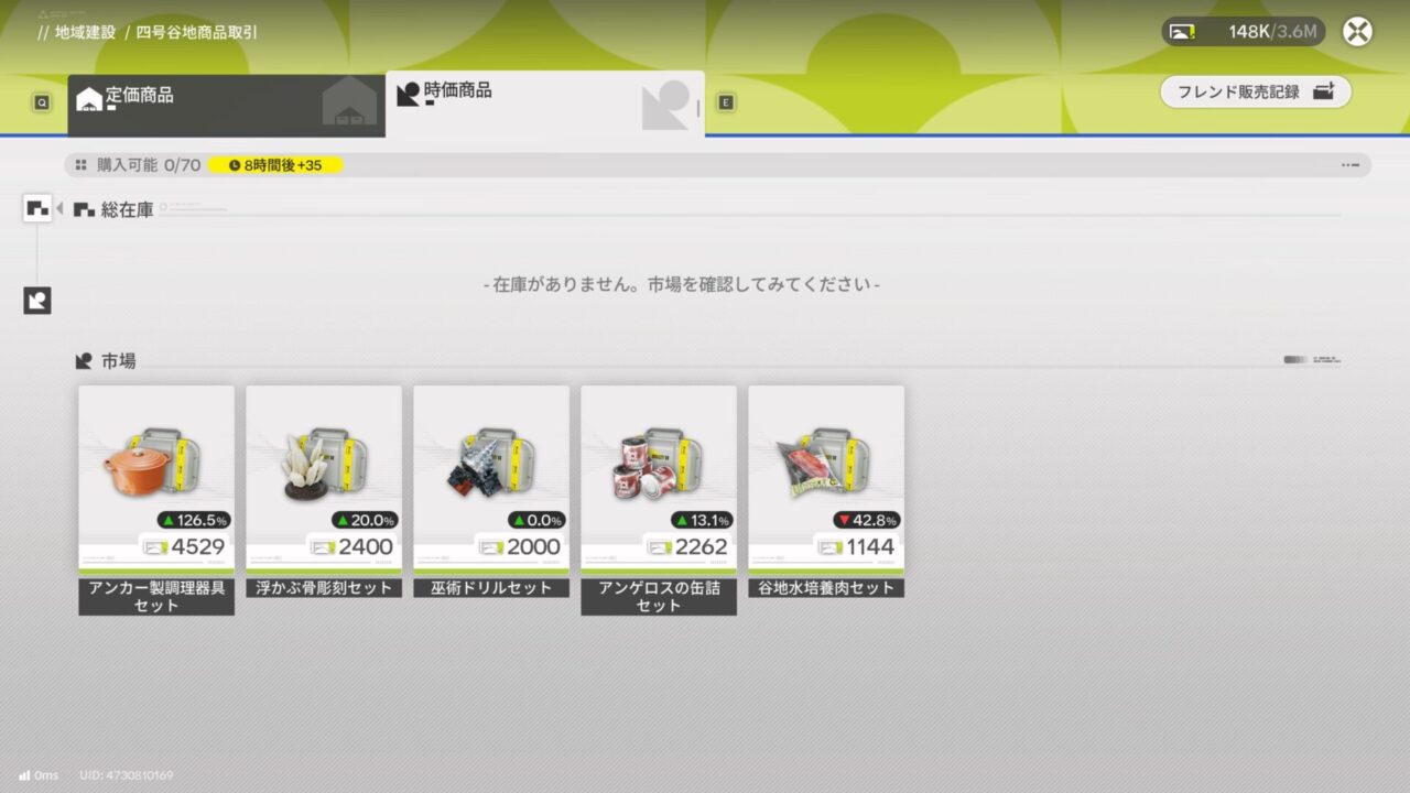 時間で価格が変動するアイテムが買えるようになった!!この時価はユーザーごとに違うので、自分のところで定価よりも安く売られているアイテムを購入し、フレンドの販売価格を確認して一番高値で売れるフレンドの帝江号へ訪問、そして売却という流れだ。