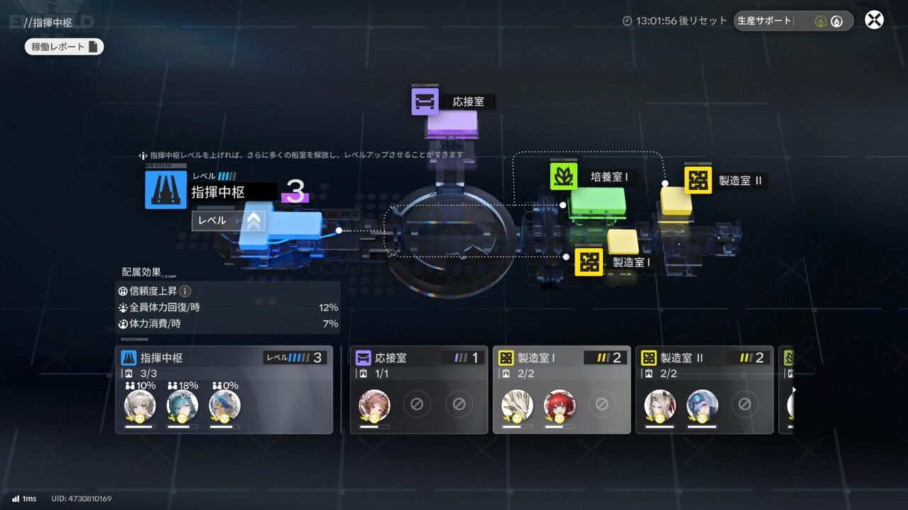 帝江号をレベルアップできるわよと呼ばれたので向かってみた。指揮中枢をレベル 3 に上げ、2 つめの製造室を建造した。培養室もレベルを上げて、オペレーターを 2 人配置できるようになった!まだ強化出来てないから製造スキルもなにもないんだけど……。
