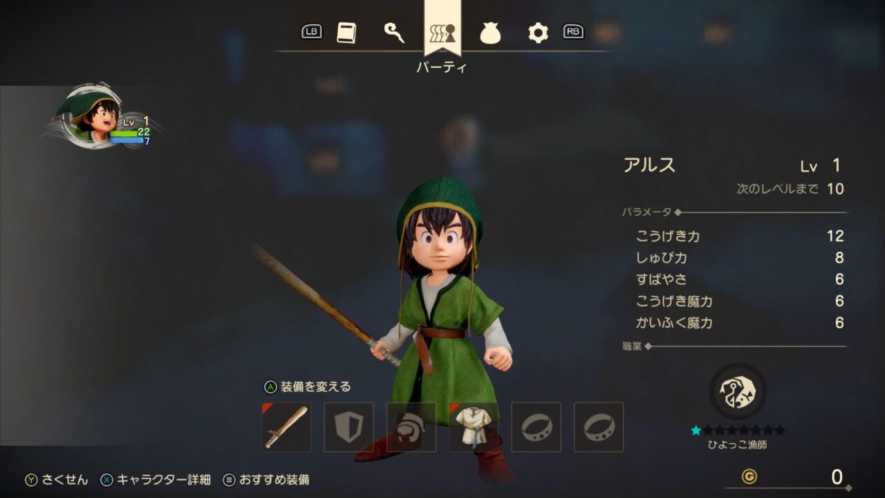 主人公、アルス!かわいいねぇ~。ひのきのぼうを持っている。武器と盾は装備したもののグラフィックが反映されるけど、防具は変わらないみたい。残念なような、それはそれで安心したような……。レベル上げ中ならではのメチャクチャ装備みたいなのも味があって好きだけど。