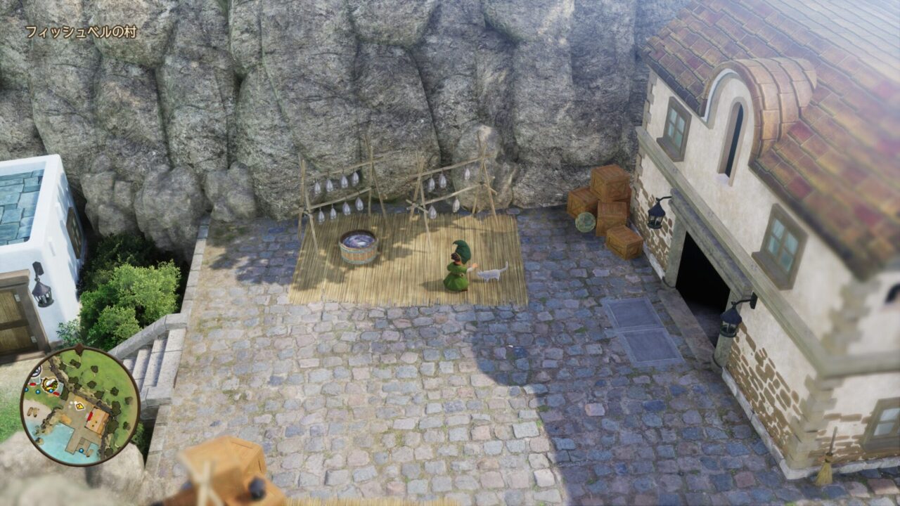 ネコチャン!フィッシュベルの村は漁村らしく、魚がいっぱい干してある。ネコチャンもいっぱいいて、のびのびと暮らしている。ンかわいいねぇ~!!つい撫でてしまう。