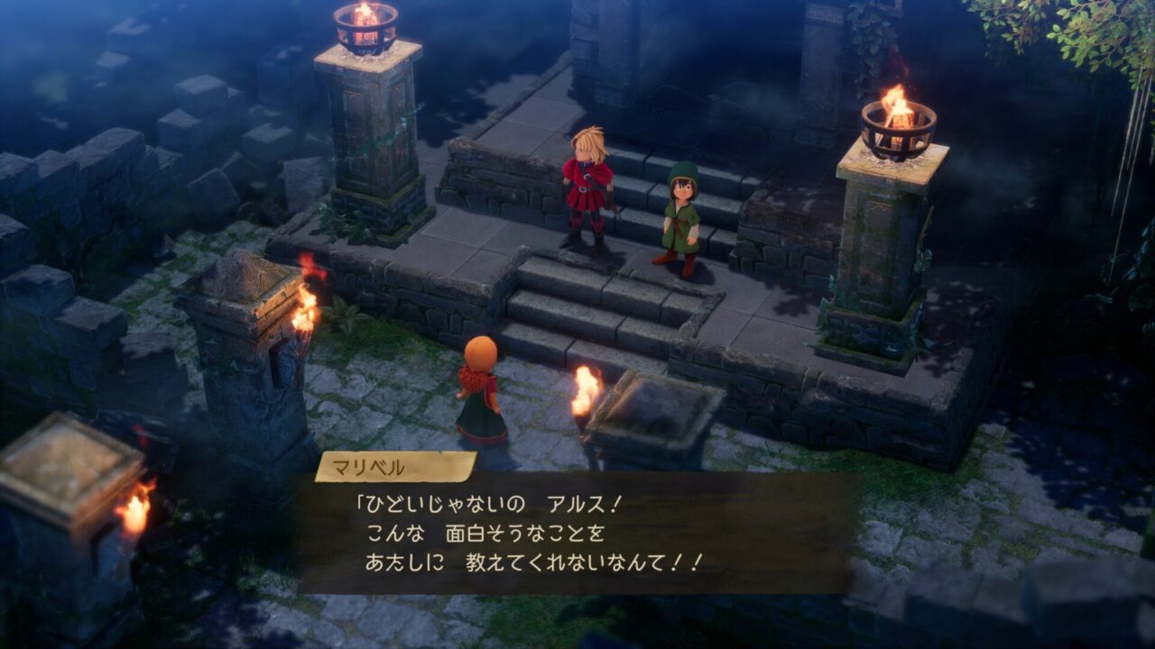 祠に入ろうとしたらマリベルが追ってきた。問い詰められているのに知らん顔して誤魔化そうとしてるアルスめっちゃ可愛い。無理やりマリベルが仲間になってきた……。