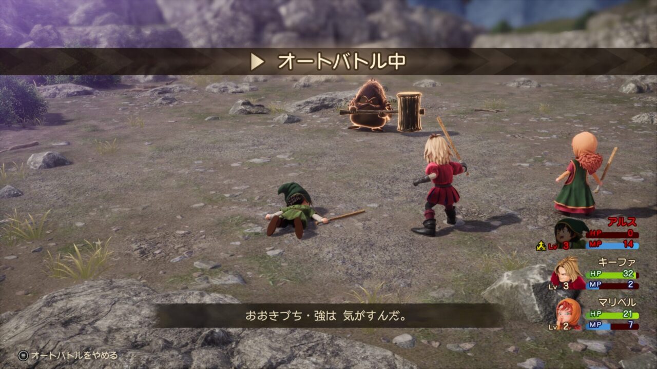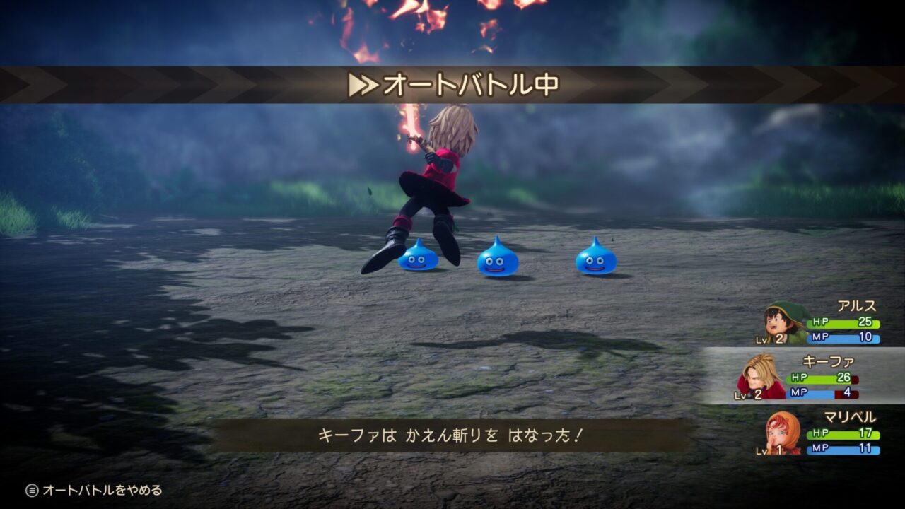 オートバトルとかいうのがあることにやっと気がついた。これめっちゃいい!いつの間にかキーファがかえん斬りを覚えている。何だその技、格好いいじゃん。