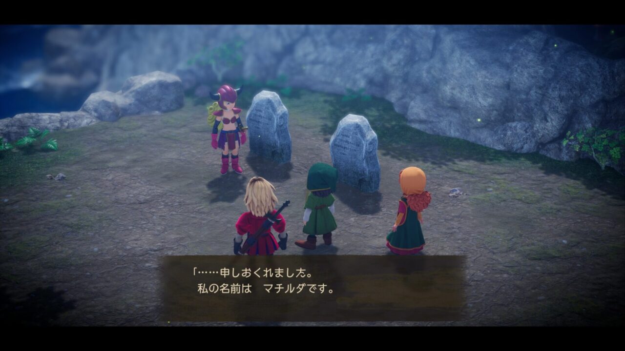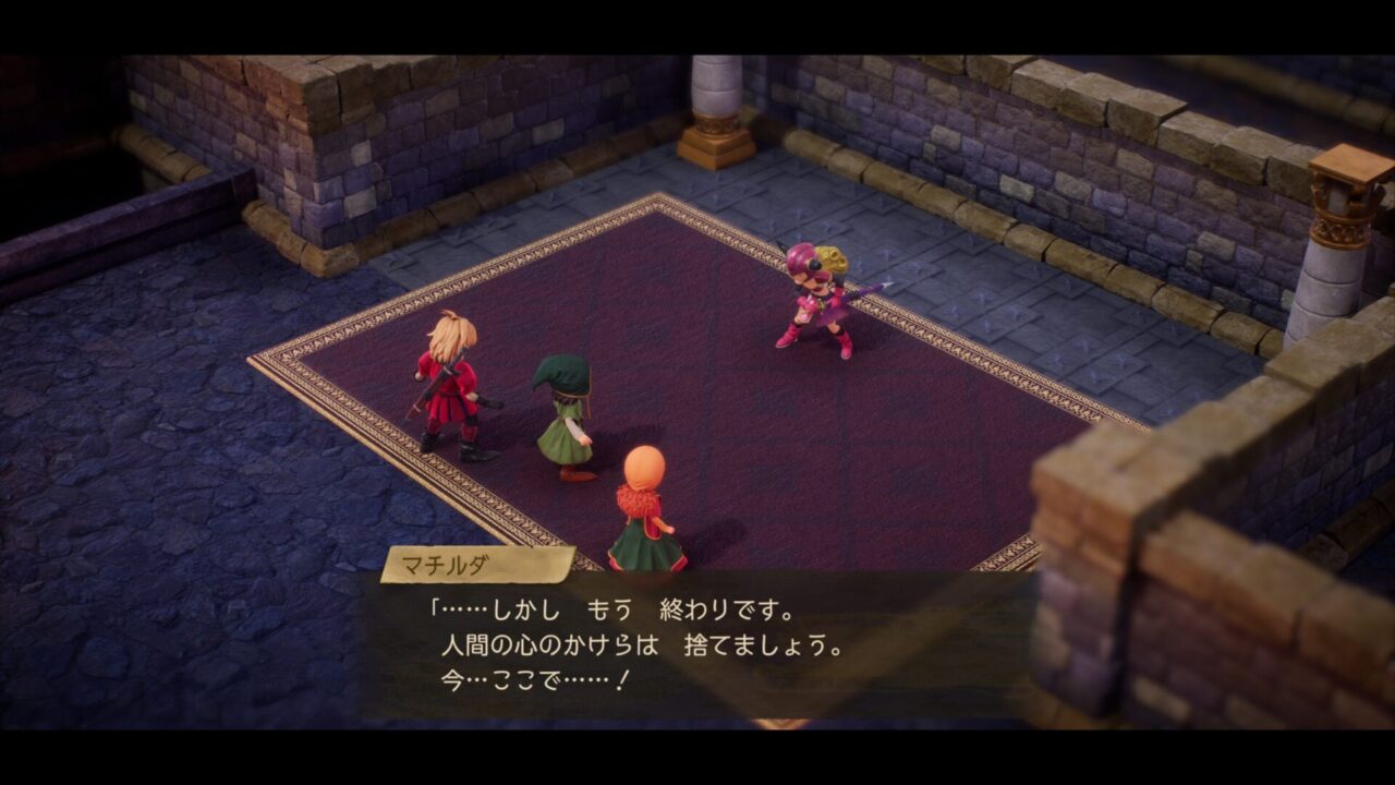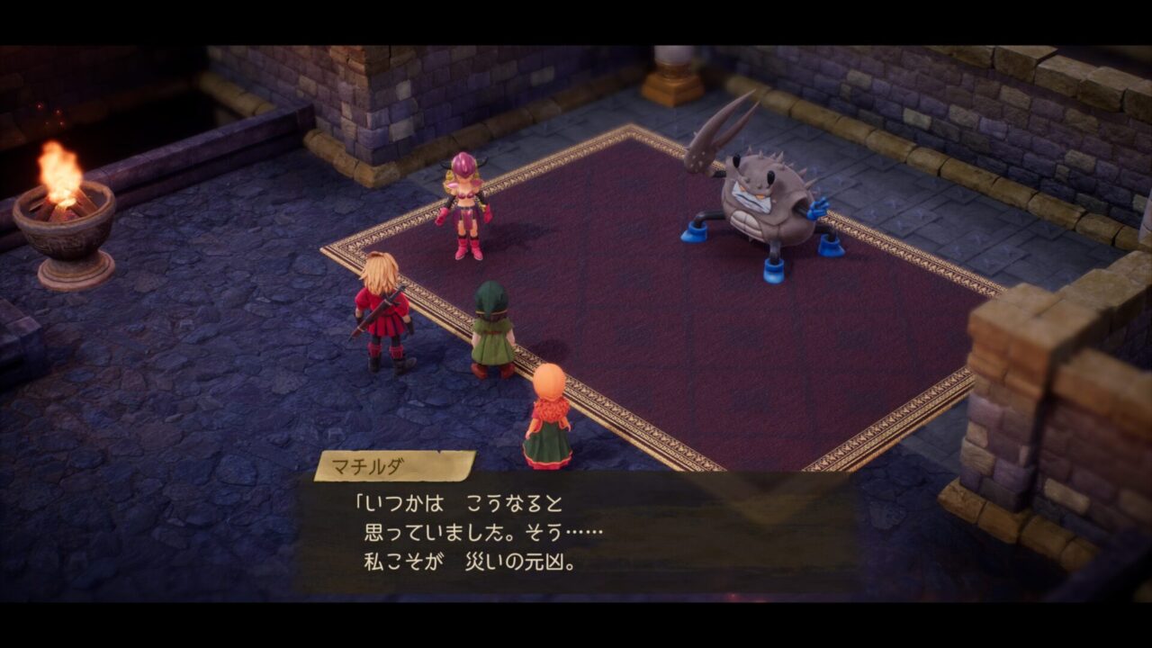 マチルダと戦うしかないのか……と思っていたところにちょうどウッドパルナの村人がやってきた。村人が今度こそ魔物に立ち向かう人間を見捨てなかったということに、マチルダは少し救われたような表情をしていた……ようにみえる。身体は魔物に変わってしまったけど、こころは人間のままだ。