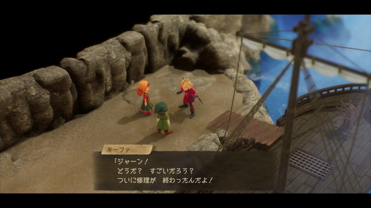 洞窟の先には立派な船があった。石板についてのヒントを得る前、キーファとアルスがこっそり直していた船らしい。これに乗って、新しくできた島に向かってみようということだった。なるほどね。
