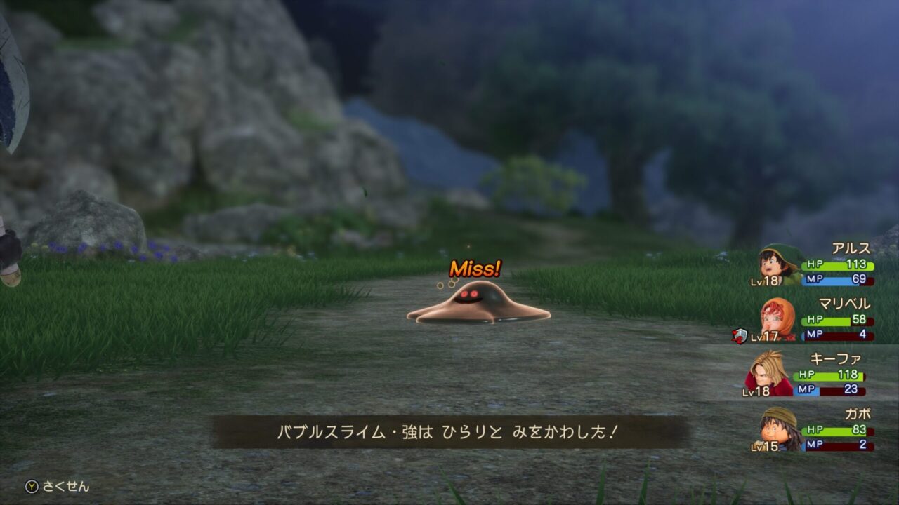 ドキドキしながら戦ってみると、全然メタルじゃなかった。バブルスライム・強だったし、めちゃくちゃ攻撃避けてくるから全然倒せない。なんだよこいつ!!