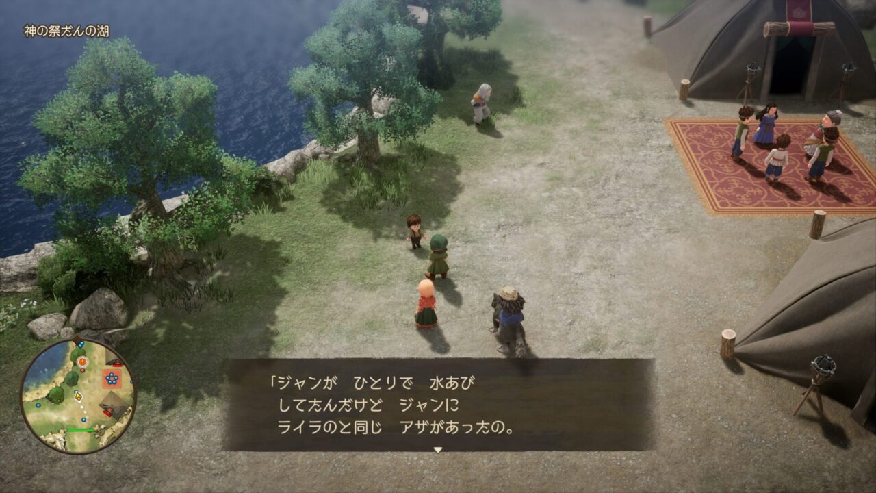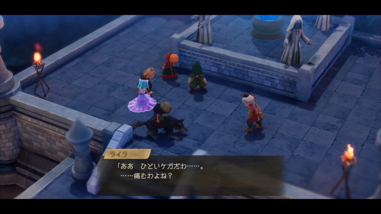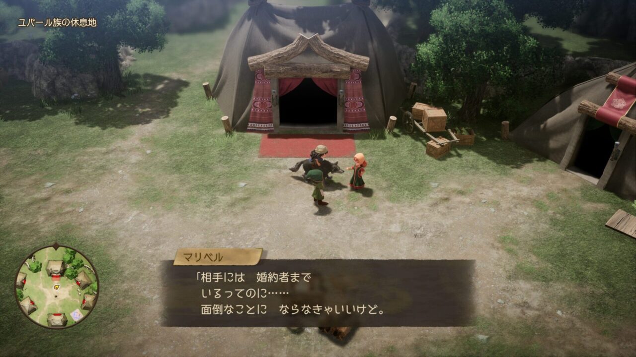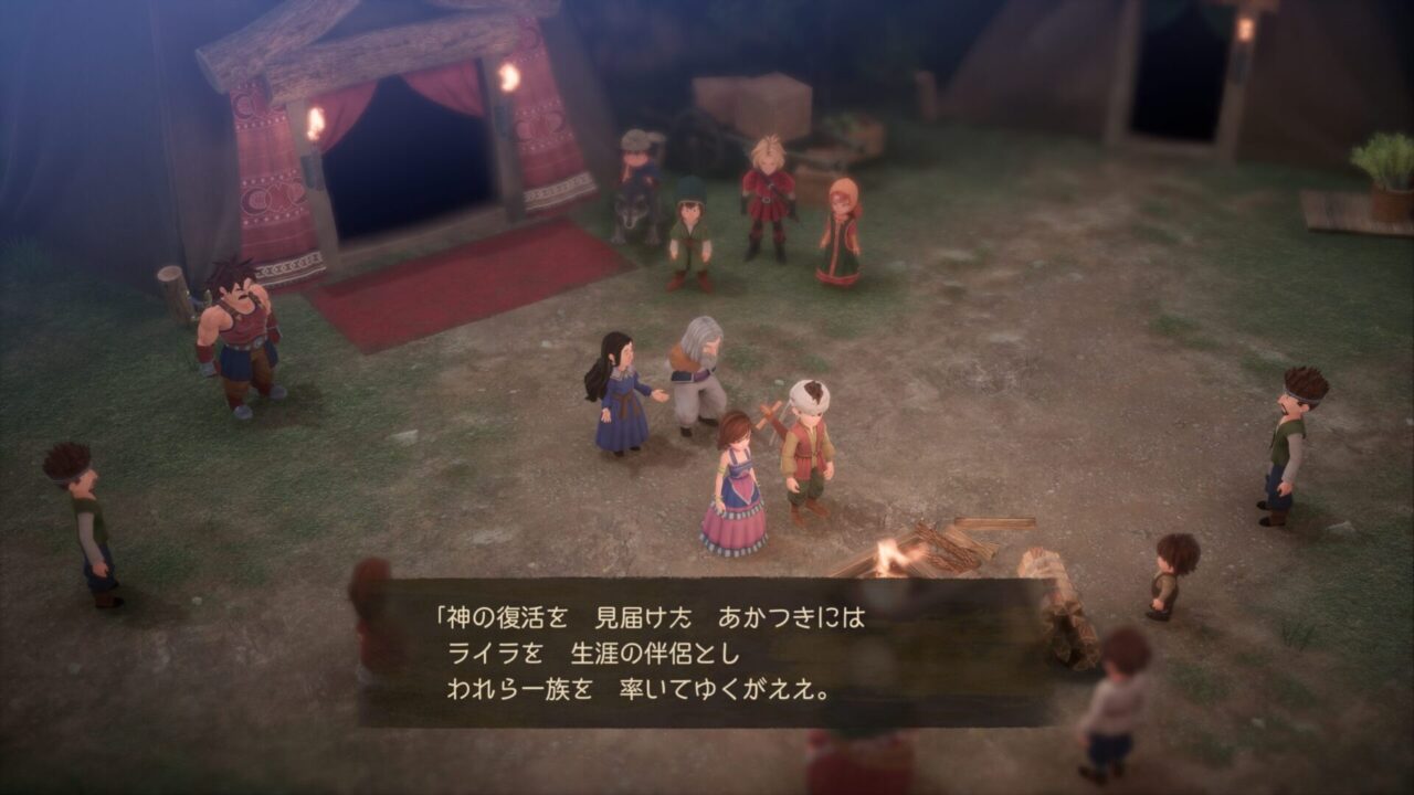パーティのみんなもそれぞれ宴を堪能することにしたようだった。ガボは命の水と呼ばれるビバ=グレイブを飲んで酔っ払い、マリベルは踊りを眺めて火のそばにいる。キーファはライラさんのテントに潜り込もうとしていたが勇気が出ないらしい。なにをやっとんねん。