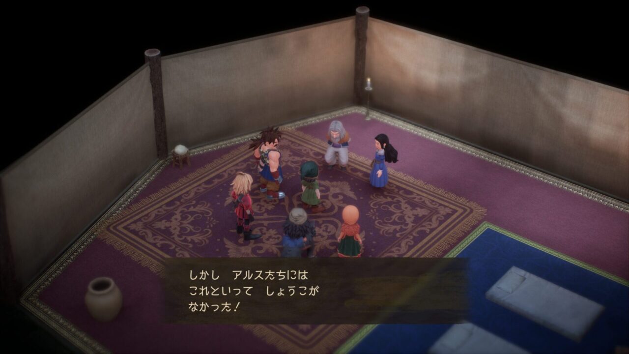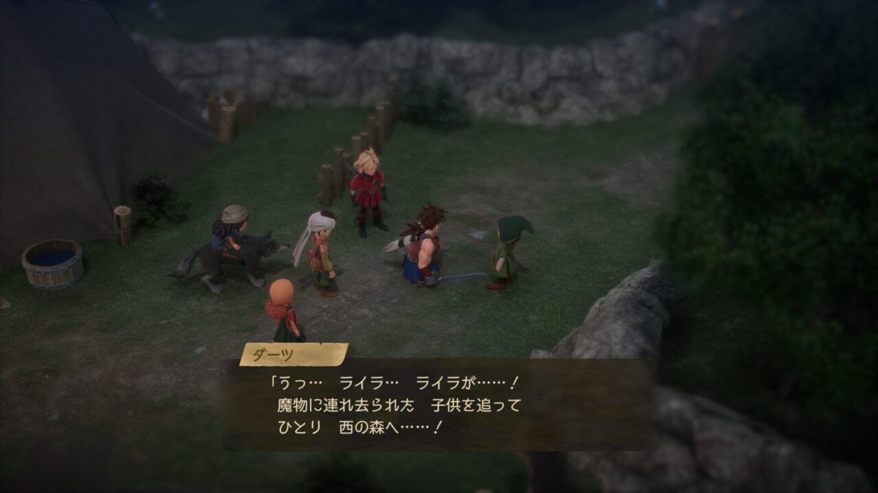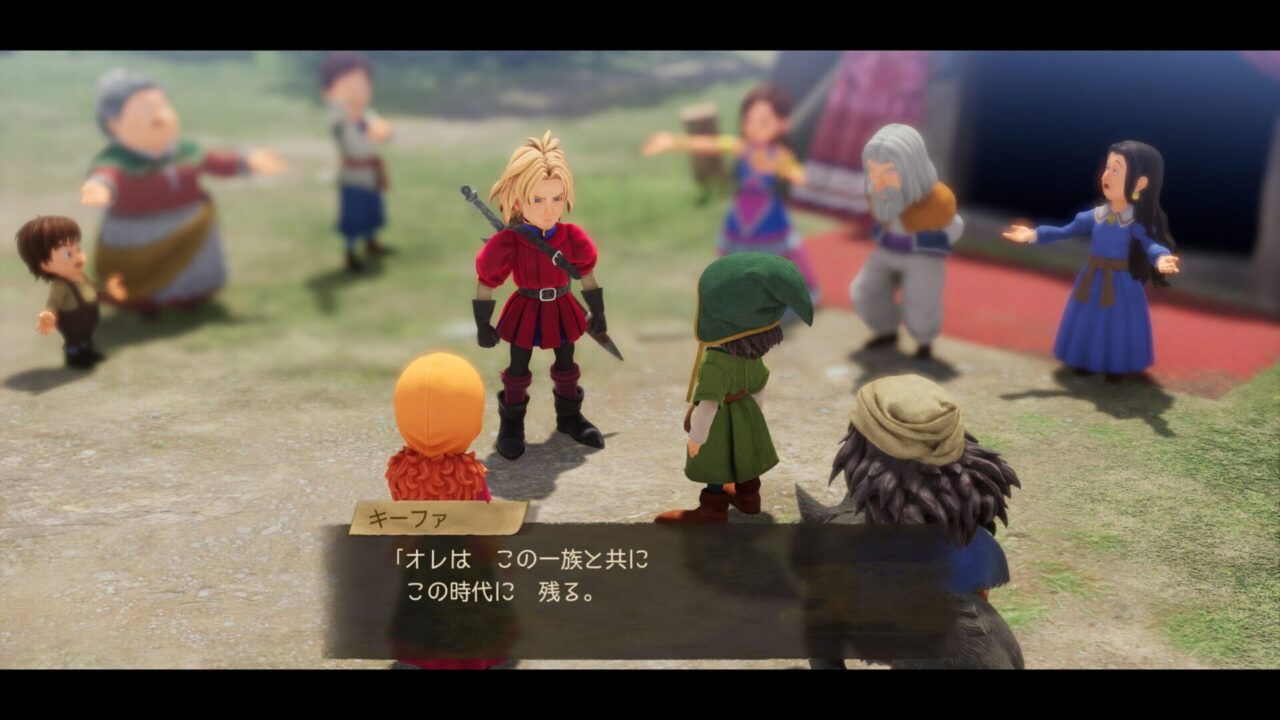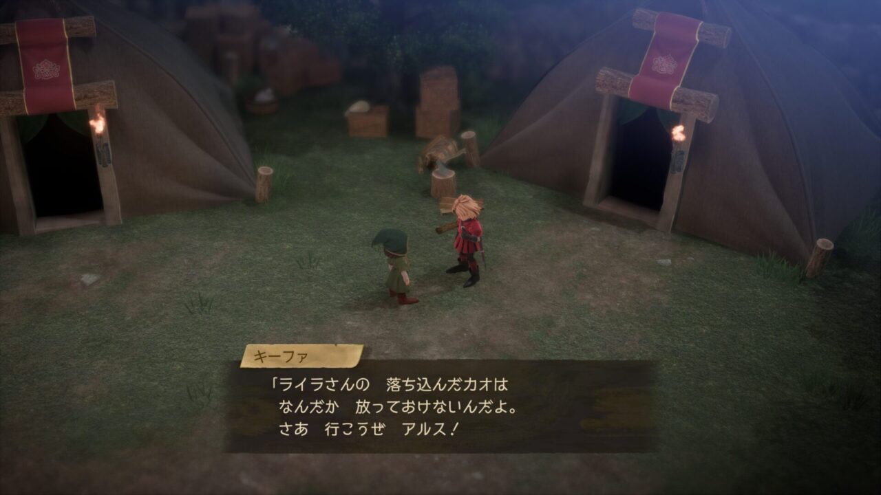 キーファの話を一通り聞き終わって、アルスは先にテントへ戻ることにした。朝になり、目が覚めると広場でキーファがダーツさんと戦っていた。どうやら一族の守り手として認めてもらうためにやっているらしい。ダーツさんを倒したキーファは守り手として認められ、パーティから抜けることを決めたらしい。