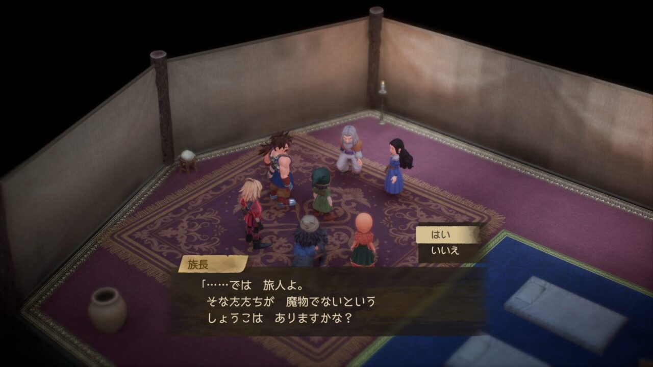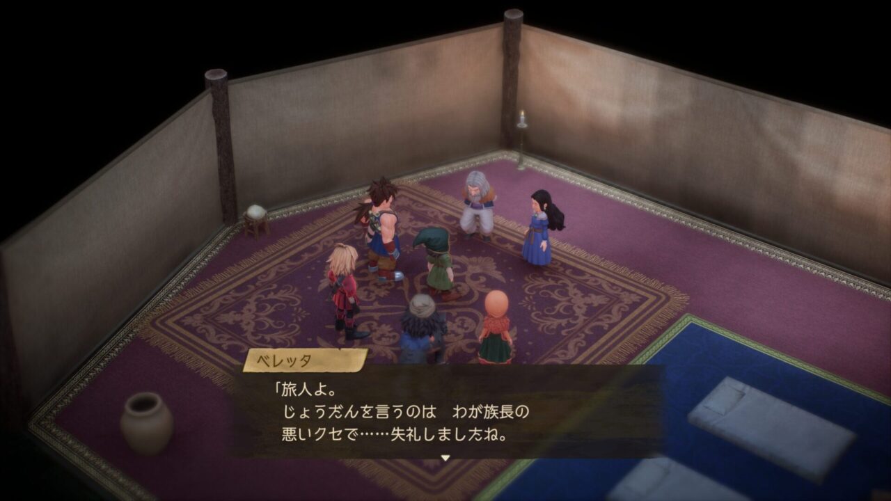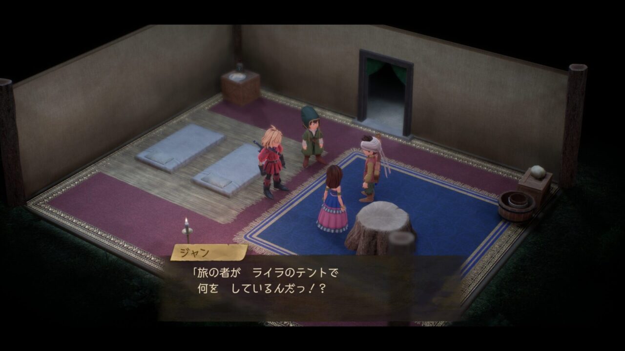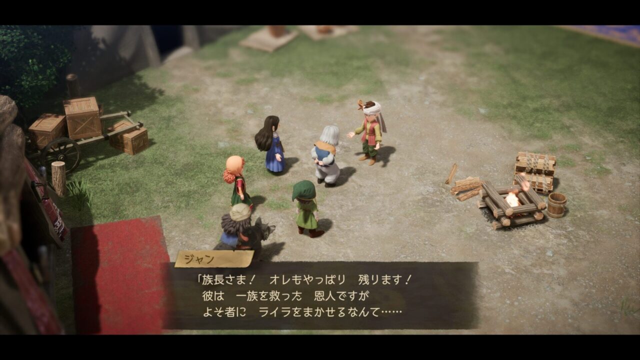 キーファの話を一通り聞き終わって、アルスは先にテントへ戻ることにした。朝になり、目が覚めると広場でキーファがダーツさんと戦っていた。どうやら一族の守り手として認めてもらうためにやっているらしい。ダーツさんを倒したキーファは守り手として認められ、パーティから抜けることを決めたらしい。
