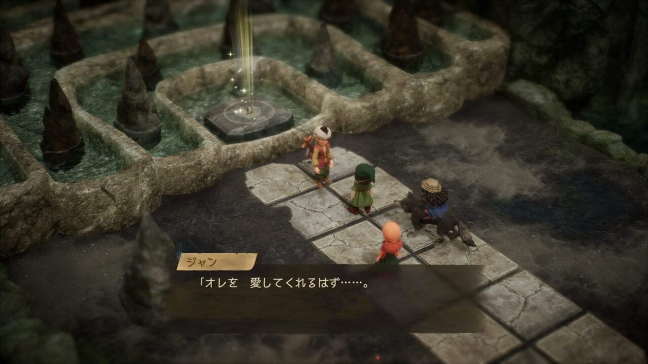 儀式は湖の底にある祭壇で行うらしいが、そこへ行く手段が見つからない。族長たちが古文書を読み直し、洞窟の奥にある仕掛けを作動すると水が引いてたどり着けるようになるとか。洞窟には魔物がいるので、ジャンを連れてアルスたちが行くことになった。