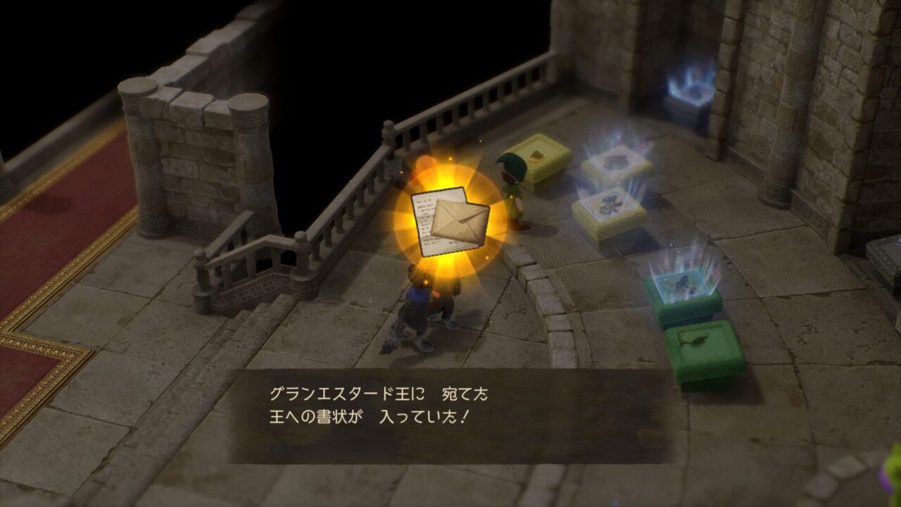 神殿に戻ってくると、袋が落ちていた。中にはキーファがつけていたはずの装備品と、手紙が二通。一通はアルス宛、もう一通はグランエスタード王宛の手紙だった。自分で届けろ!!