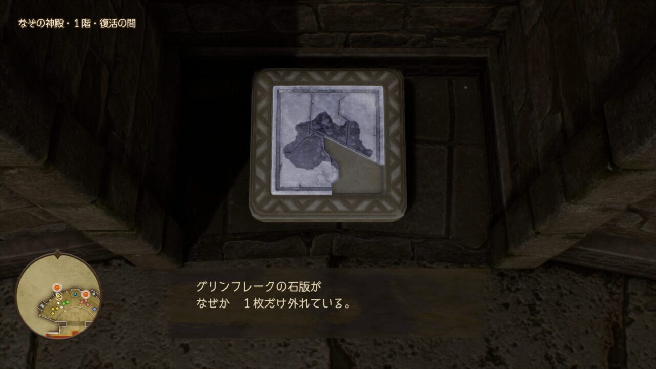 なぞの神殿に着いたが、グリンフレークの石板がいつの間にか一枚外れていた。なんでだろう。もう一度はめ直して、過去の世界へ向かう。