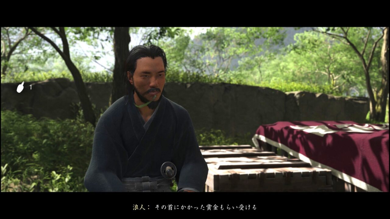 狼を助けて、そのへんに散らばっていたアイテムを漁ってウキウキしていたら浪人が話しかけてきた。どうやら賞金稼ぎのようで、篤の首を狙ってきた。おお、ついに自分の首を狙う輩が現れたか。ちょっと嬉しいな。あっという間に返り討ちにして、持っている情報を聞き出す。