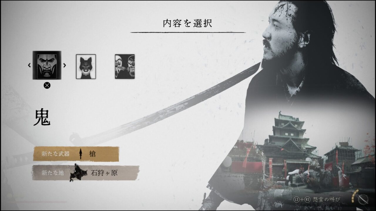敵はそれぞれ別のエリアにいるらしい。誰から狙うかここで選択肢が出た。え~~めっちゃ迷う~~!!誰からでも正直いいんだけど、まぁ順番にやっていくか。石狩ヶ原にいる鬼を倒しに行こう。このストーリーを進めるとどうやら槍が使えるようになるっぽいな。