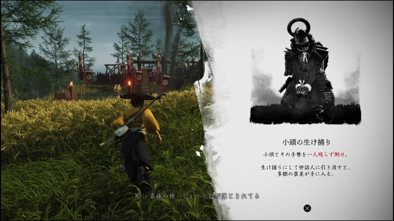 羊蹄平の南の方にある篝火台に近づいたら、斎藤の旗が掲げられていた。どうやら占拠されているようだ。ここの小頭とかいうやつを生け捕りにすれば、報酬がたくさんもらえるらしい。ぜひやりましょう。手下の雑魚どもは殺してしまっても構わんらしい。