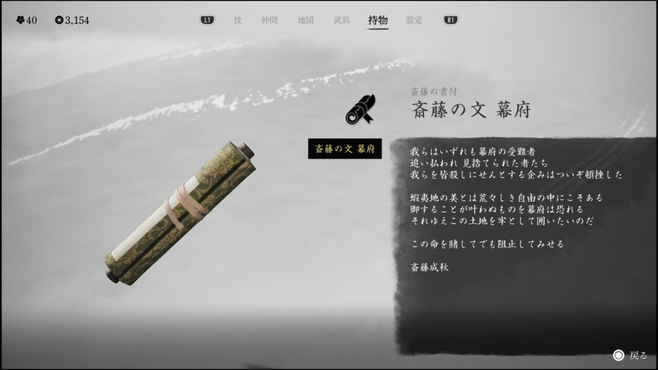 古賀砦でのイベントが終わったあと、羊蹄平の篝火台で戦利品を漁っていたら重要そうな文を見つけた。斎藤が書いたものらしい。