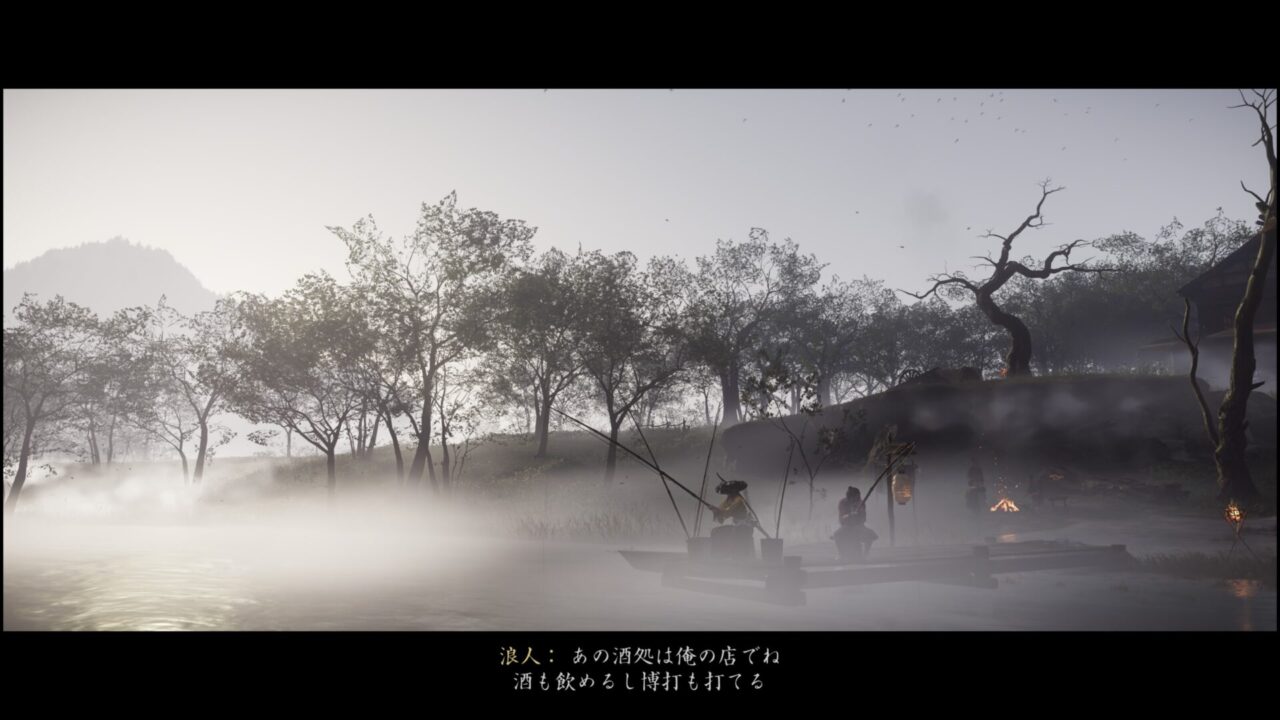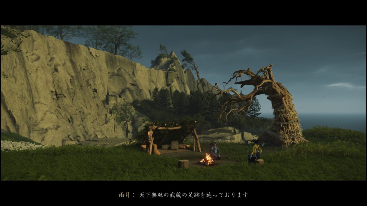 沿岸にある大きな木のそばで、語り部の雨月(うげつ)と出会った。ちょっと前に出会っていたのだけど、いまは手持ちの話がないとかで自己紹介を交わしただけだった。今回はこの木にまつわる、天下無双の武蔵(たけぞう)に関する話をしてくれた。