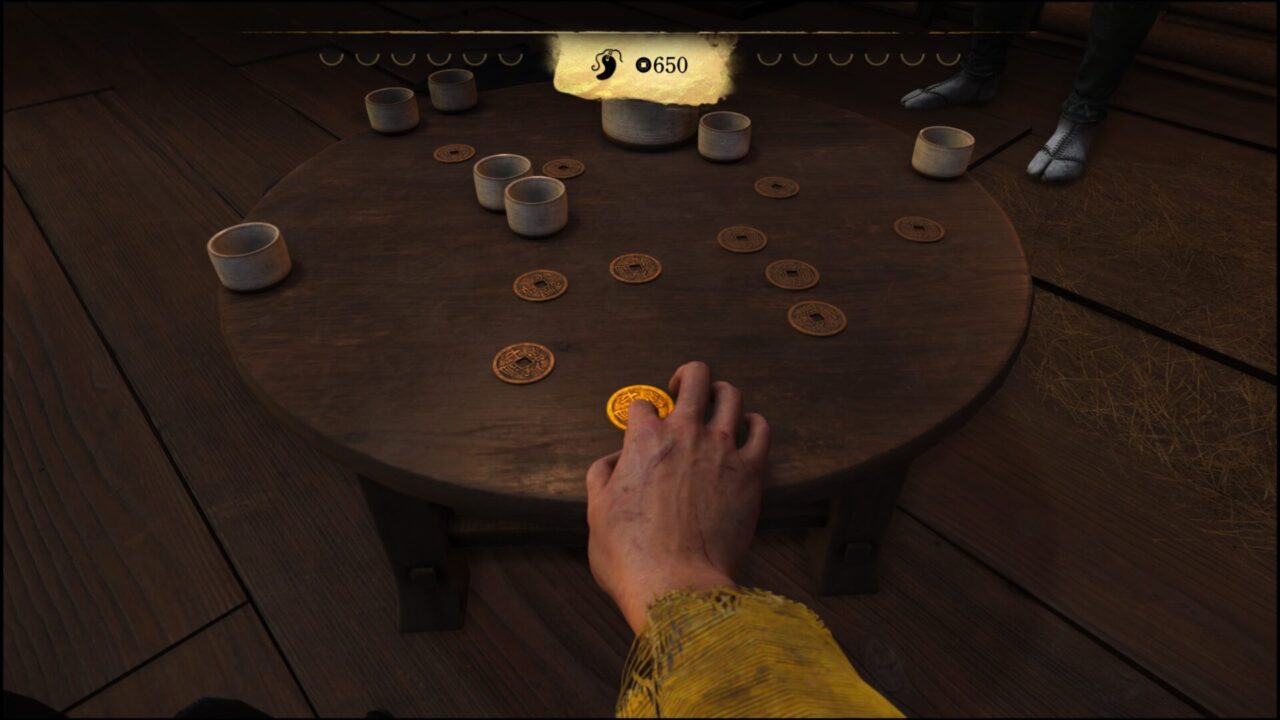 最初に一枚銭を選んだら、ほかの銭一枚だけに当たるよう指で弾くゲームらしい。弾いた銭が他の銭に当たらないか、二枚以上の銭に当たると相手のターンになってしまう。一枚だけに当たれば得点で、また自分のターンになる。机においてある湯呑みには当たっても大丈夫。机から落ちてしまうと得点にはならない。