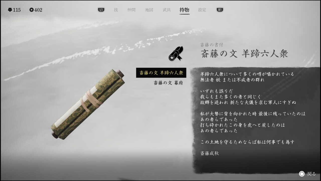 斎藤どもへの怒りがどんどん増していく。羊蹄平の探索がもうすぐ一段落するはずなので、はやく鬼に会いに行かなくちゃ。羊蹄六人衆についての噂を聞いていたら、いろんな武器の達人や新しい武器をつくっている人の情報も手に入れたのでそっちにも行きたい。