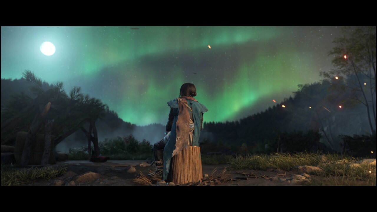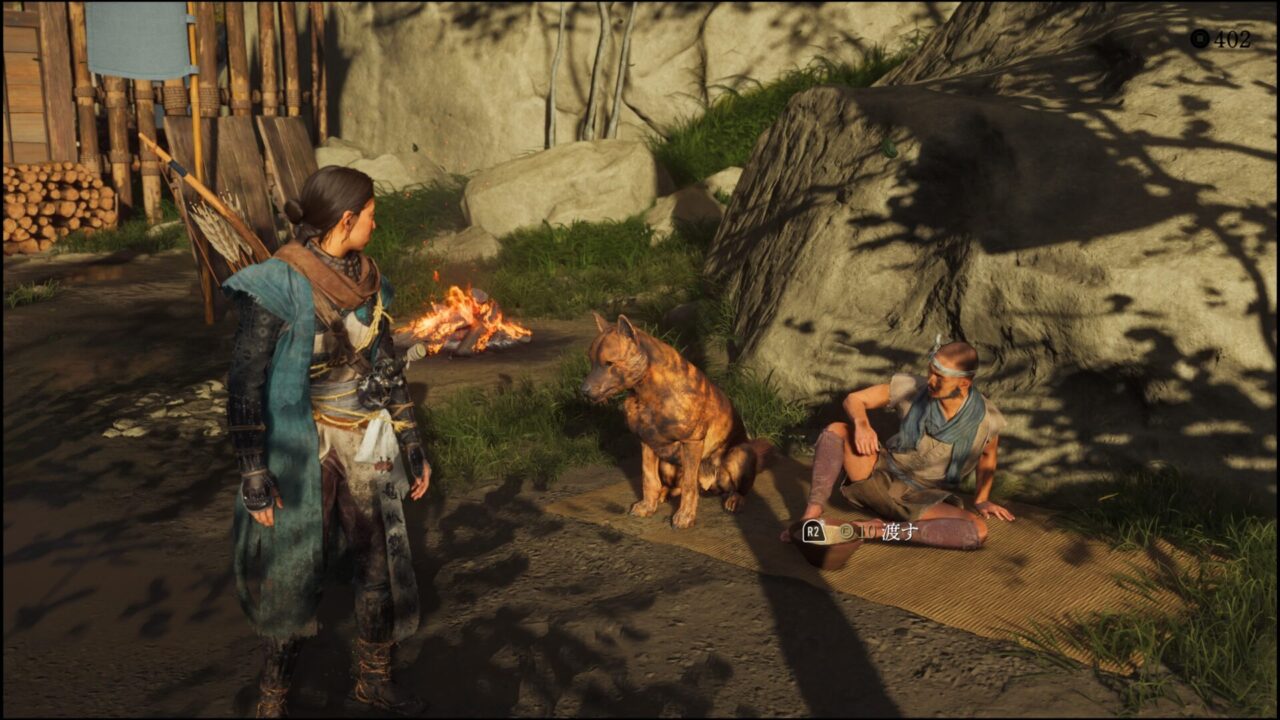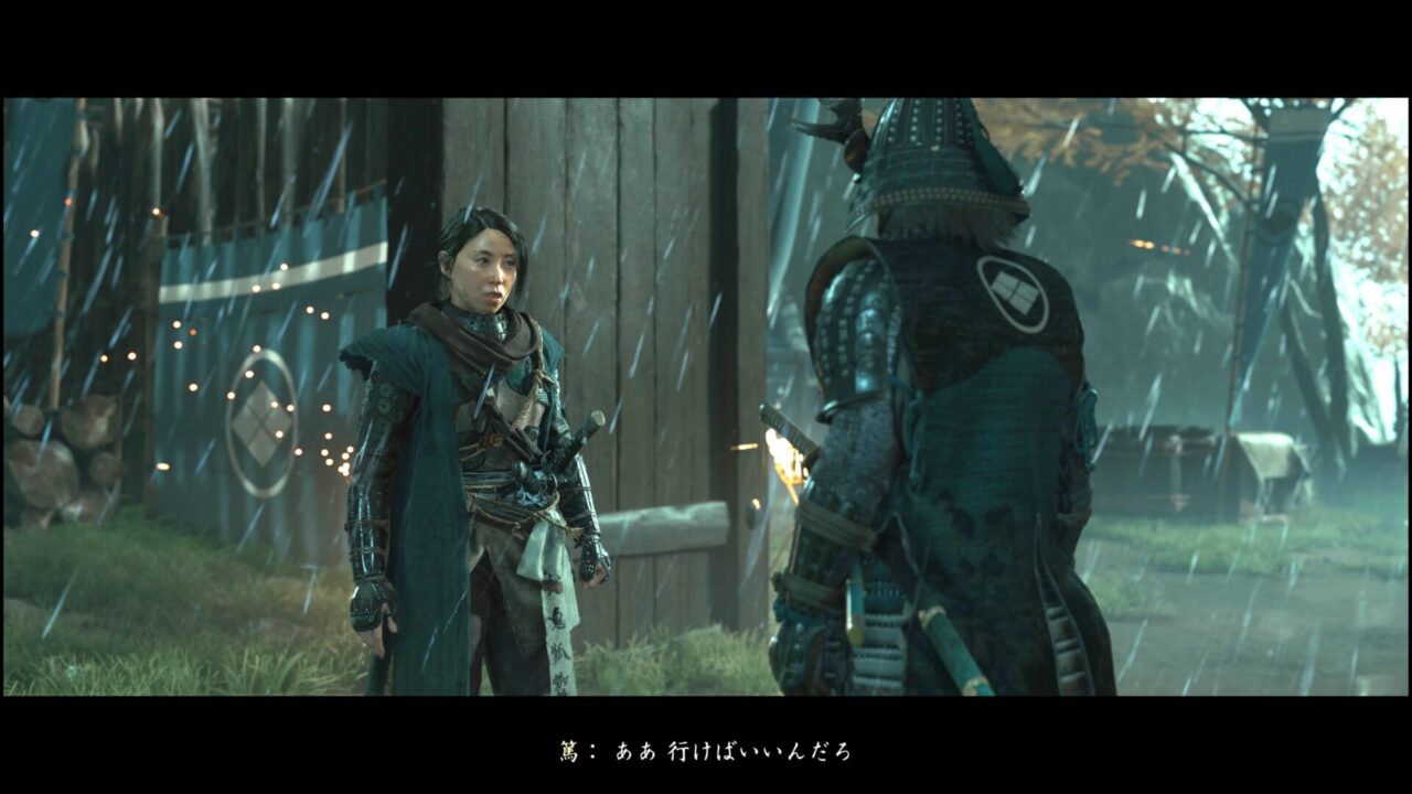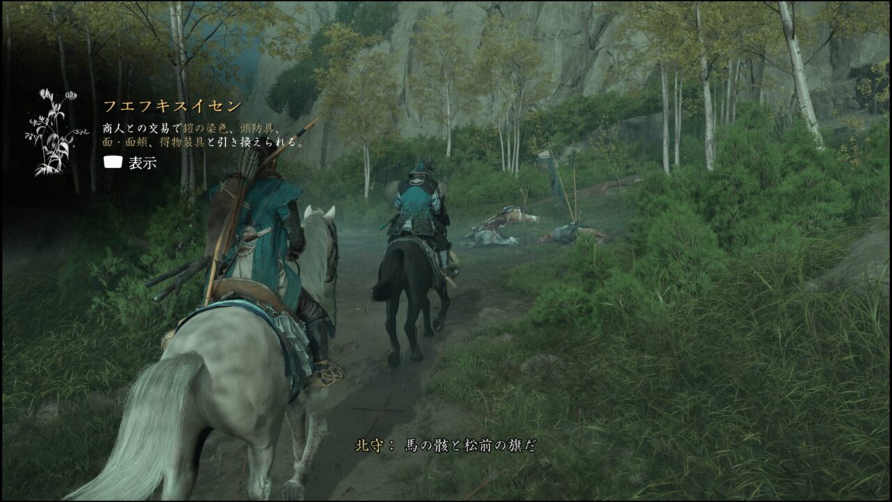 侍は北守という名前らしい。きたもり?でいいのかな。自己紹介はされていないが、字幕にそう書いてある。とともに道を進むと、馬の死体があった。松前の旗もあったので、これは松前侍たちの馬だろう。馬に乗っていたはずの人間の姿がない。死んだ後に移動させられたなら血の跡があるはずだけど、ここには足跡しか残されていなかった。自分の足で移動したらしい。逃げたか、捕まったか、どっちかな。