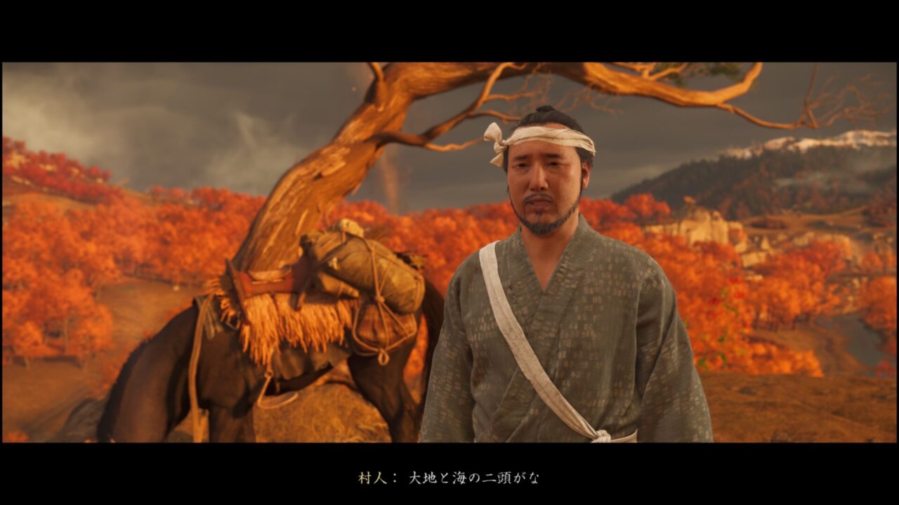 困っている村人が居た。馬を三頭連れていたが、そのうちの二頭……大地と海という名前の馬が何かに驚いて逃げてしまったらしい。大地・海と来たら三頭目は空か?何を隠そう、ぼかぁ前作ゴーストオブツシマで愛馬の名前を空にしていましてね……。三頭目の名前は聞けずじまいだったが、もし空だったらちょっと嬉しいな。