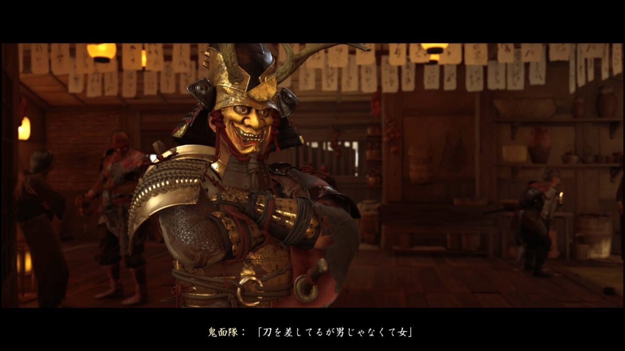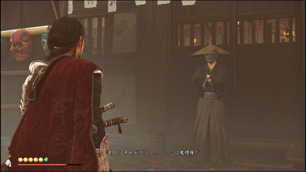 鬼面隊の集まる酒場だという鬼燈屋に入ってみようとしたら、お面がないと入れないと言われた。えー!?仮面舞踏会かよ。まぁお店がそういう方針なら従うか……。なんか良いお面あったかな……。