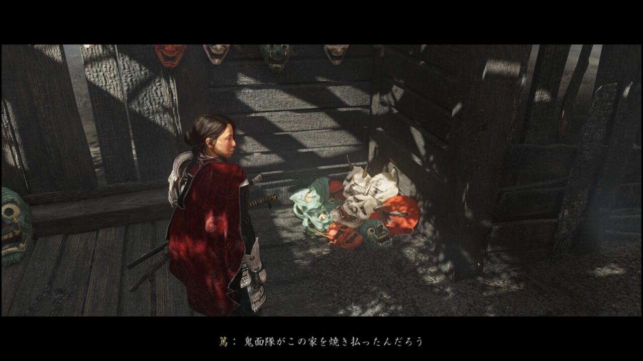 お面屋さんに青姥の家の場所を聞いて向かってみると、すでに焼かれた後だった。家の中には息子のものと思われる人形や、鬼面隊を襲って手に入れた大量の面があった。息子ごと家を焼かれて、悲しみのあまり暴れているのかもしれない。