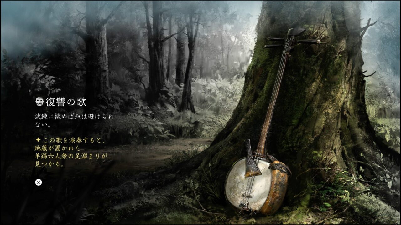 三味線を弾いている男と一緒に新しい歌を思いついた!地蔵のある六人衆の足溜りが見つかる歌らしい。三味線の効果で新しいアクティビティ見つけるのやったことないな。最近は狼呼び出し機になってしまっている……。
