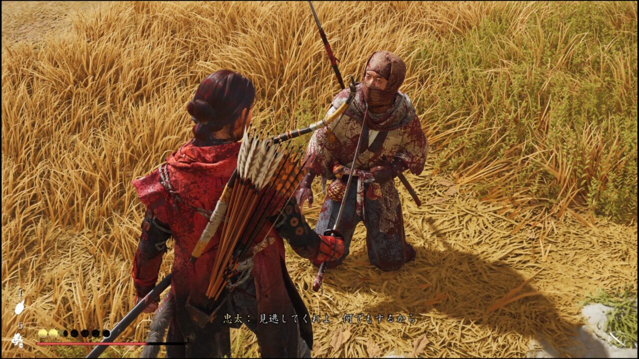 川を超え、北にある森で松前侍の骸を見つけて進んでいく。刀が沢山刺さっているエリアがあって、そこへ行くと忠太が現れた。以前のようなコソ泥って感じじゃない。堂々とした出で立ちだ。賞金が 1,500 文もかかっているだけある。