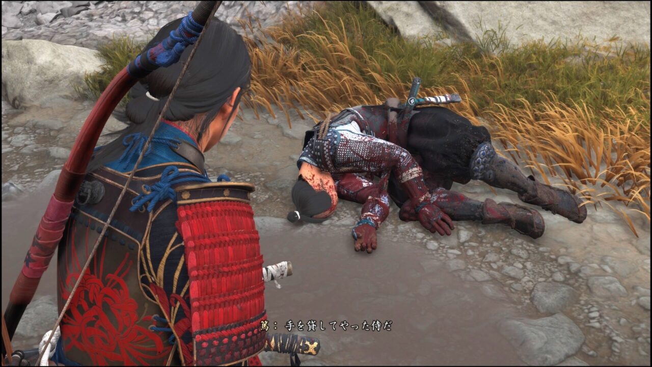 以前、侍を助け出した洞窟のあたりで犬に襲われている浪人が居た。忠太かと思ったが、どうやら違うらしい。浪人は怪我をしていて、血の匂いに誘われてやってきたんだろう。犬を倒し、毛皮を貰って、浪人に話しかける。こいつは忠太と一緒に侍を襲ったと言っていた。