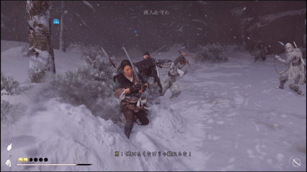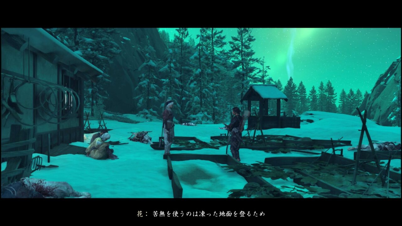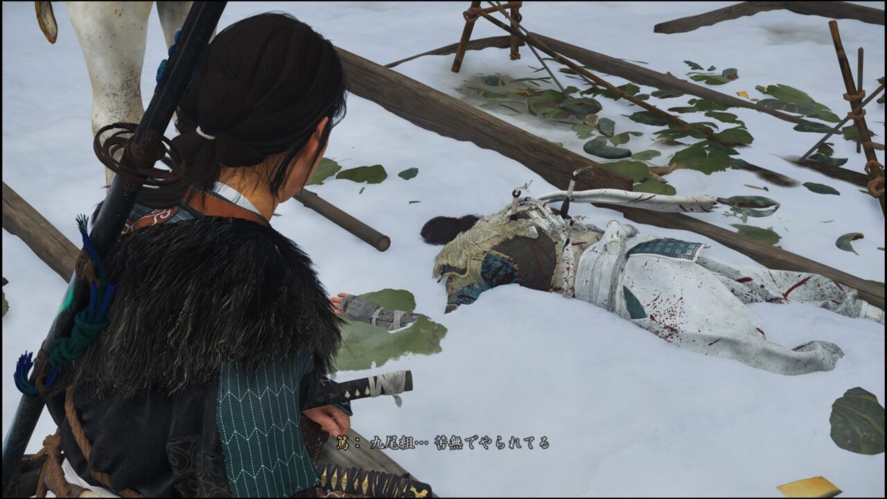 赤鶴屋を無視してめちゃくちゃサイドストーリー進めてしまった。雪景色かなり良いな~!忍との戦闘はちょっと苦手かもって思ったけど、燃える苦無を手に入れたのですこし楽になると良いな。次回は赤鶴屋に行って狐の情報を得ようかな!