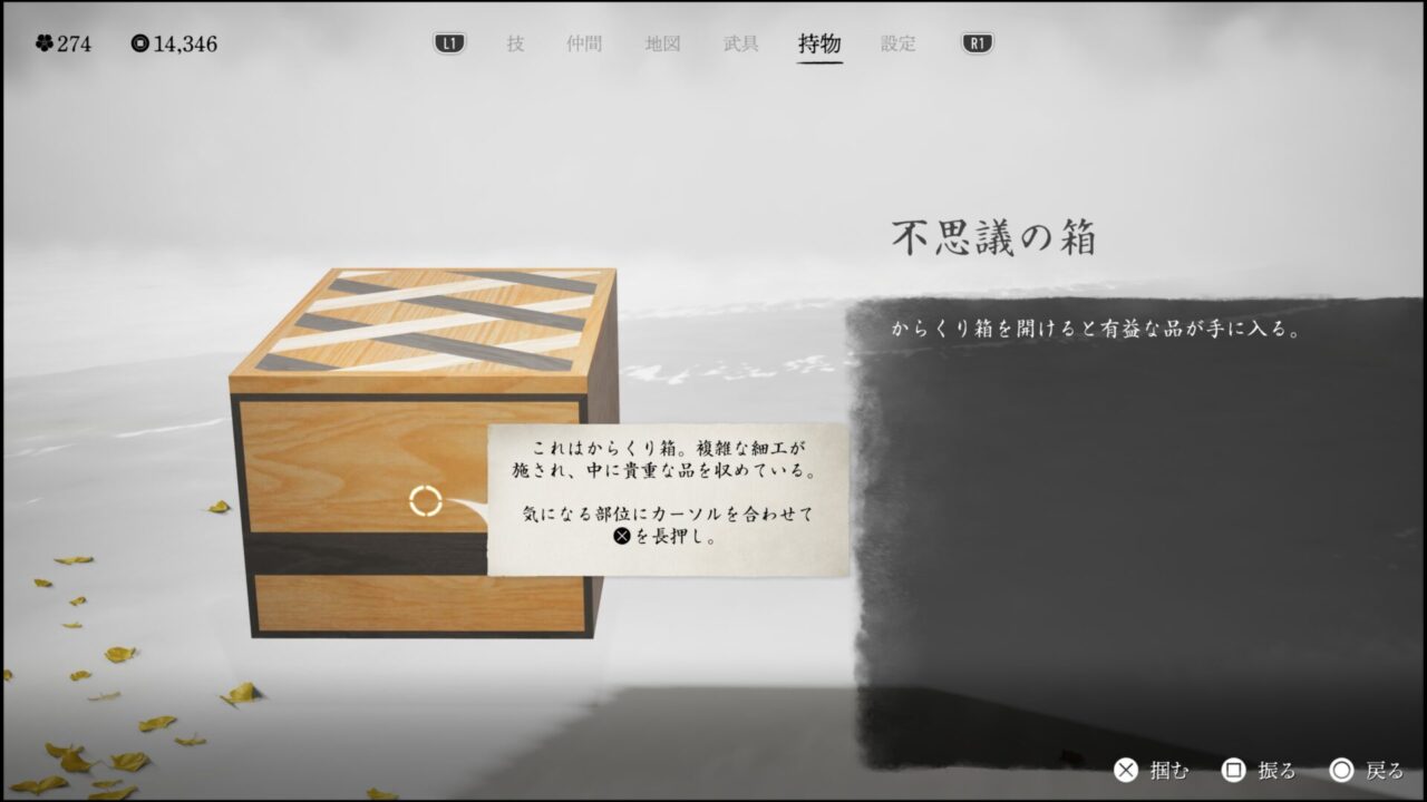 何かの社でからくり箱というのを拾った。普通に開けようとしても開かないが、特定の手順を踏むと開けられる仕掛けの箱だ。パーツをずらして、一番上面の蓋が開けば中身を取り出せる。けっこう面白い!最初に手に入れた箱からは、誰何の勾玉というのが入っていた。