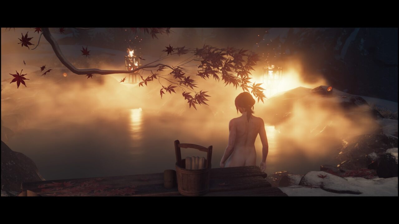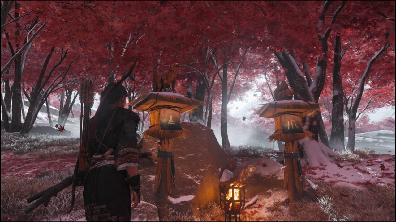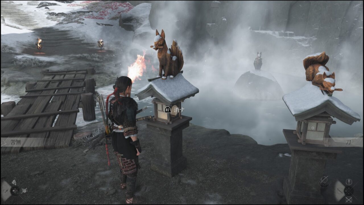また別の場所、温泉に入りに来たら怪しい広場があるじゃねーの。ここもさっきの戸のない家と同じく狐の像と、火を灯すギミック。ここにはさっきのマークがなくて、奥にある像と同じものに火を灯せばいいっぽい。