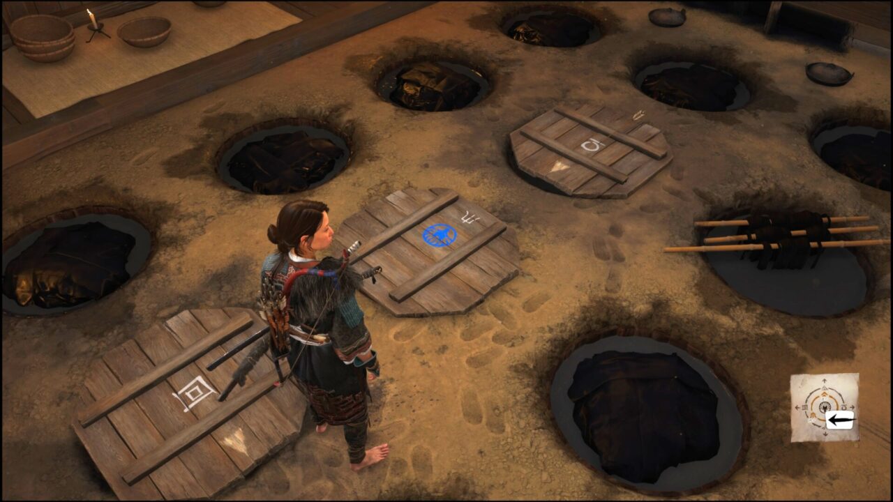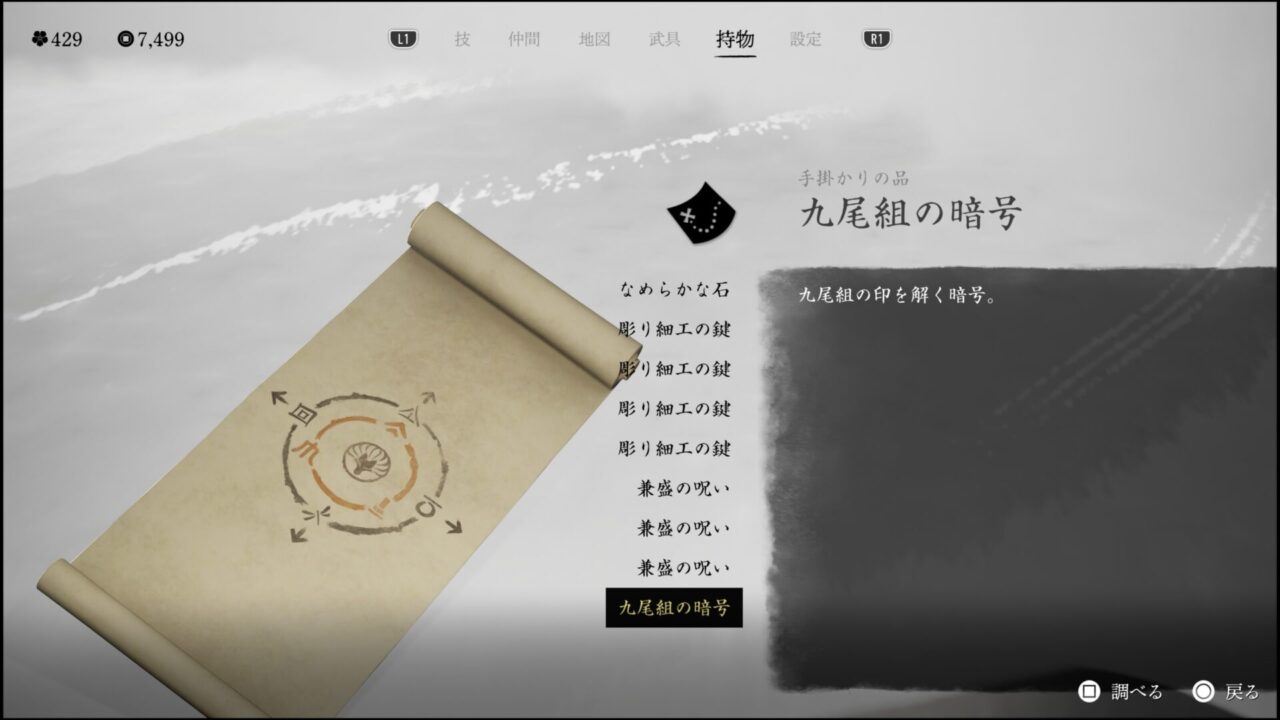 店の中が気になったので入ってみると、壁には九尾組のマークが付いている。床に掘られた穴には染色のためと思われる黒い液体が入っていたりしたが、木の蓋に暗号が描かれている。ぼくこれ解けますよ!やらせてください!