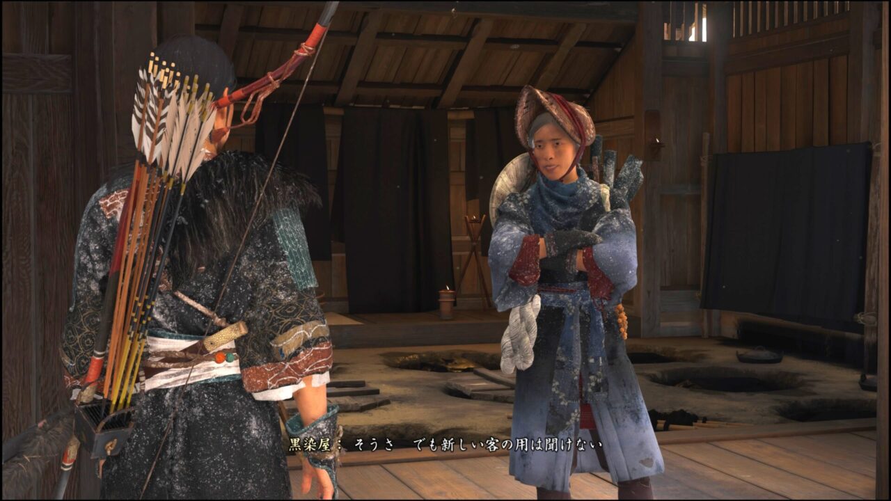 黒染屋さんを見つけたので装備を染めてもらおうと立ち寄ったら、新規の客の用は聞けないといわれた。誰かを気にしているような素振りをしていたが、頭装備と面だけは売ってもらえた。なんだか妙だな……。